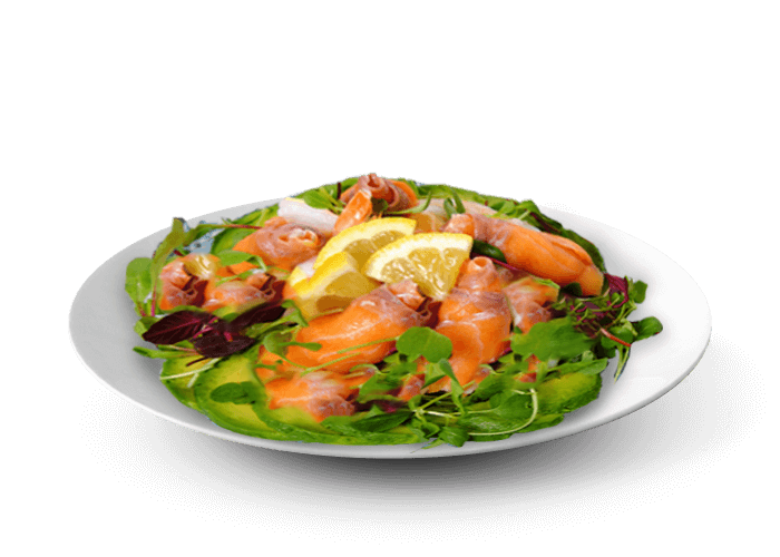 Crème fraîche, mozzarella, tranches de saumon fumé, pavé de saumon, aneth, citron vert.
